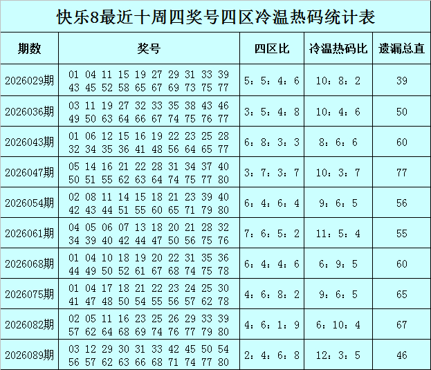 福彩快乐8第2026089期(上周四)开奖回顾:03 12 29 30 31 33 42 45 50 54 56 57 62 63 66 68 71 74 77 80,其中奖号四区比为2:4:6:8,冷温热码比为5:3:12。